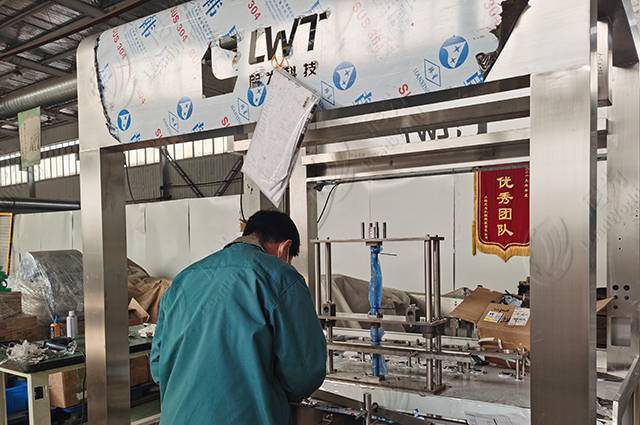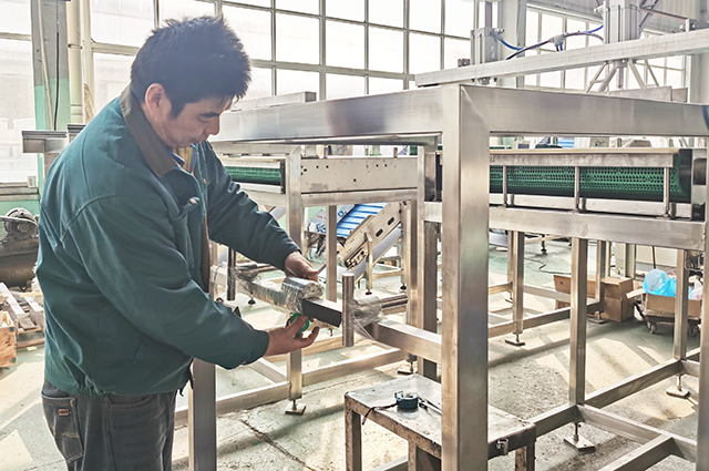 這臺目前正在組裝中的設備是我們的活塞灌裝機,該灌裝機將被用來灌裝番茄醬。設備采用304不銹鋼,不僅保證了設備外觀干凈美觀,也方便設備清洗和保養。
